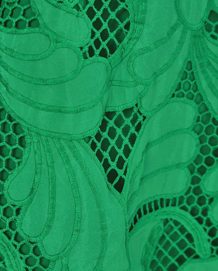 - Fit-and-flare midi dress with a halter neckline, bodice cups, and a scalloped hem.