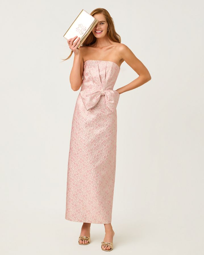 - Fitted, strapless maxi dress with a pleated bodice, interior corset, and bow detail at the waist.