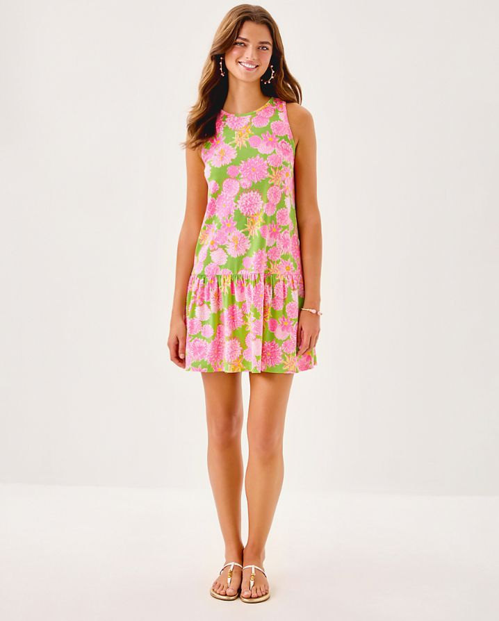 • Swing fit tank dress with cut-in armholes, a back keyhole detail, and a tall hem ruffle.